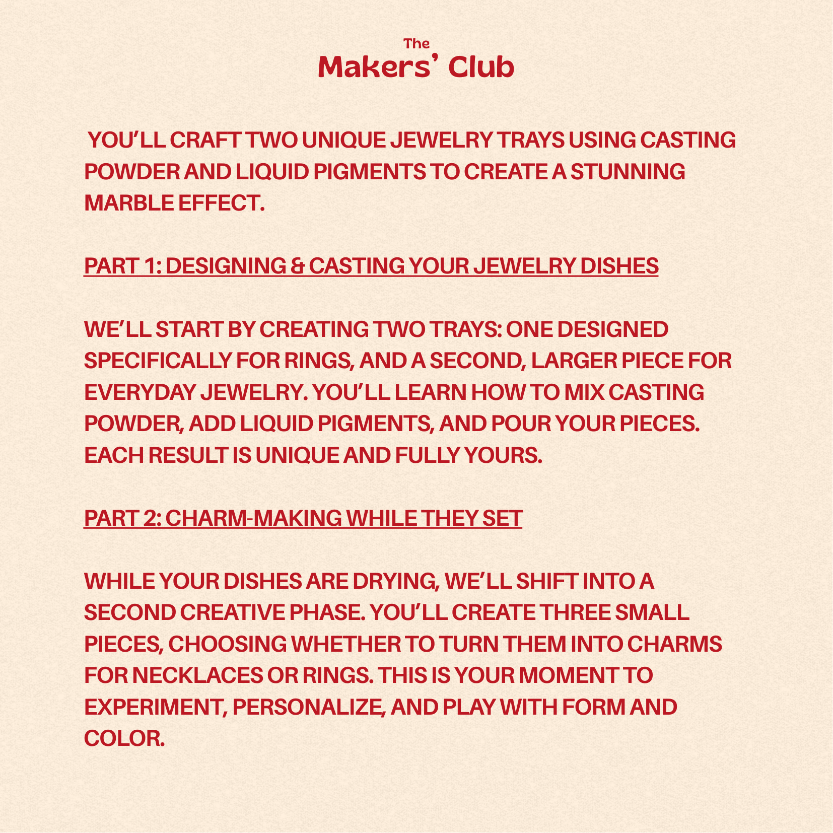 This January, slow down your afternoon and get hands-on with a playful yet design-driven workshop. Join The Makers’ Club for a creative session where you’ll craft two unique jewelry trays using casting powder and liquid pigments to create a stunning marble effect. No previous experience needed—just curiosity and creativity.